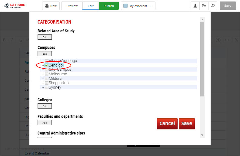 5. Save and publish the event page.CMS screenshot, save and publish event categorisation